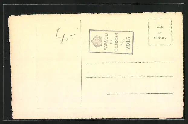 Personenbezogene Daten auf der Rückseite der Karte wurden durch blauen Textmarker unkenntlich gemacht. Die blauen Stellen sind auf die Vorderseite durchgeweicht und wirken sich negativ auf das Postkartenfoto aus