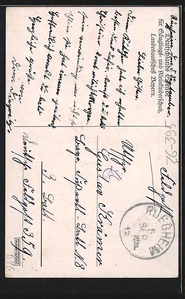 Personenbezogene Daten auf der Rückseite der Karte wurden durch blauen Textmarker unkenntlich gemacht. Die blauen Stellen sind auf die Vorderseite durchgeweicht und wirken sich negativ auf das Postkartenfoto aus
