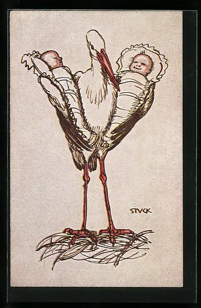 Künstler-AK Stuck: Klapperstorch mit zwei Babies