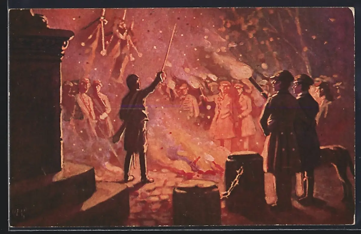 Künstler-AK Studenten mit Fackeln um ein Feuer herum