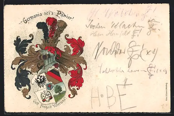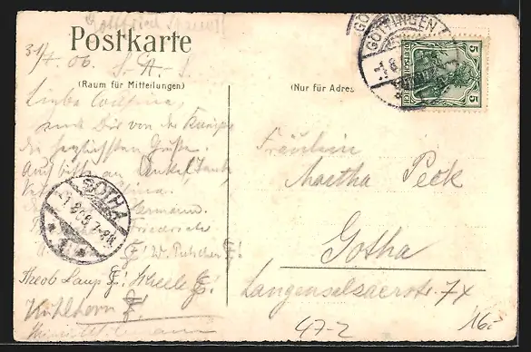 Personenbezogene Daten auf der Rückseite der Karte wurden durch blauen Textmarker unkenntlich gemacht. Die blauen Stellen sind auf die Vorderseite durchgeweicht und wirken sich negativ auf das Postkartenfoto aus