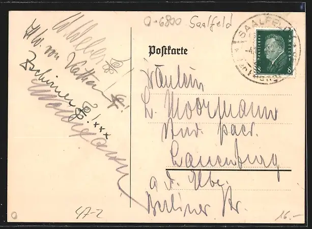 Personenbezogene Daten auf der Rückseite der Karte wurden durch blauen Textmarker unkenntlich gemacht. Die blauen Stellen sind auf die Vorderseite durchgeweicht und wirken sich negativ auf das Postkartenfoto aus
