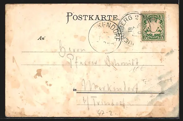 Personenbezogene Daten auf der Rückseite der Karte wurden durch blauen Textmarker unkenntlich gemacht. Die blauen Stellen sind auf die Vorderseite durchgeweicht und wirken sich negativ auf das Postkartenfoto aus