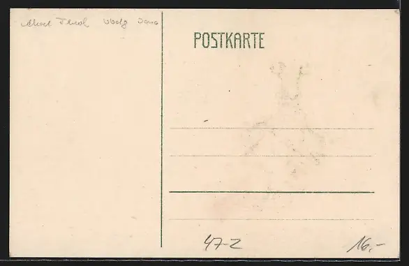 Personenbezogene Daten auf der Rückseite der Karte wurden durch blauen Textmarker unkenntlich gemacht. Die blauen Stellen sind auf die Vorderseite durchgeweicht und wirken sich negativ auf das Postkartenfoto aus