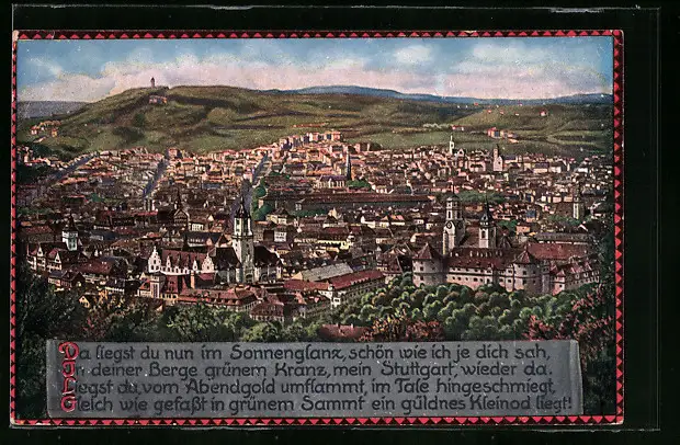 Künstler-AK Stuttgart, Gesamtansicht aus der Vogelschau