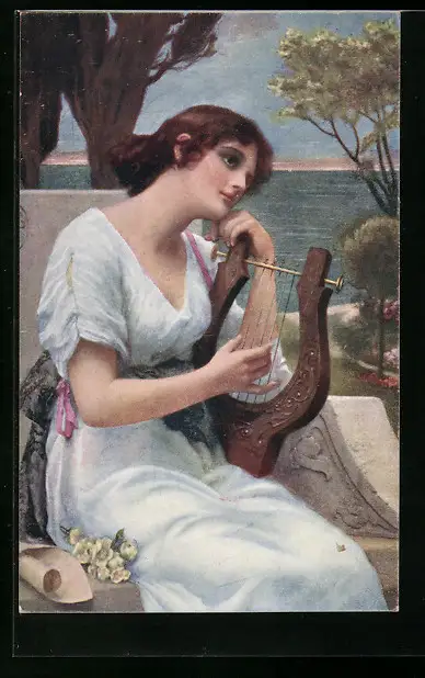 Künstler-AK Süsse Klänge, Frau mit Lyra