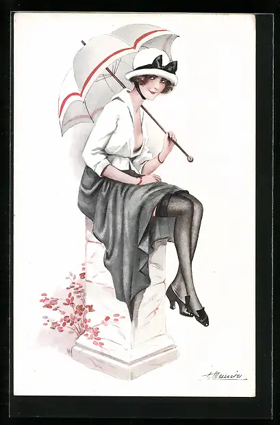 Künstler-AK Suzanne Meunier: Elegante Dame mit Regenschirm