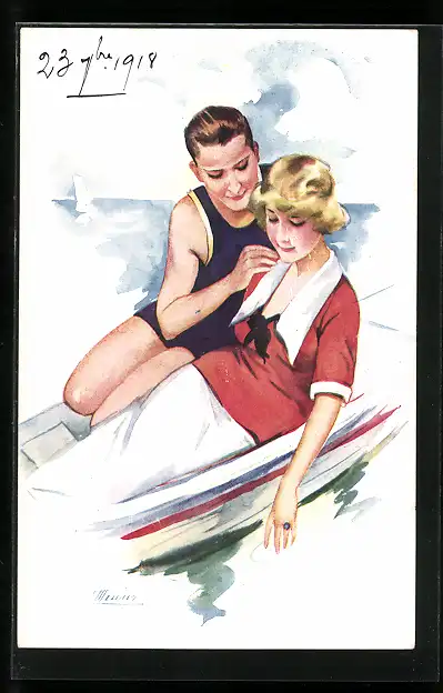 Künstler-AK Suzanne Meunier: ein Liebespaar in einem Ruderboot