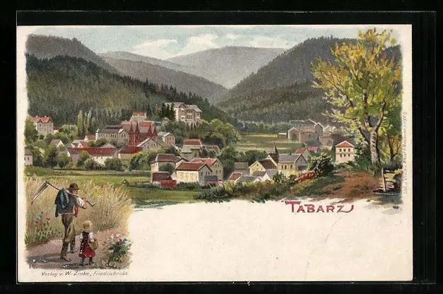Künstler-AK Tabarz, Ortsansicht und Bauer mit Sense und Kind