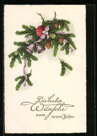 Künstler-AK Tannenzweig mit Glocken und Pilz an Neujahr