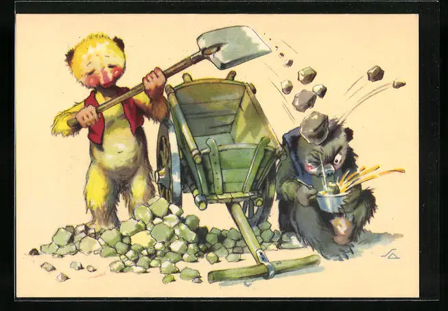 Künstler-AK Teddybär ist mit der Schaufel ungeschickt