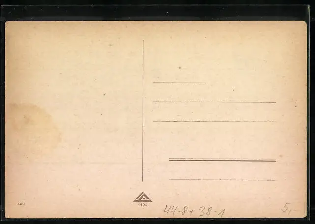 Personenbezogene Daten auf der Rückseite der Karte wurden durch blauen Textmarker unkenntlich gemacht. Die blauen Stellen sind auf die Vorderseite durchgeweicht und wirken sich negativ auf das Postkartenfoto aus