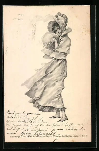 Künstler-AK Theo Stroefer Nr. 8: Dame im Mantel mit Muff