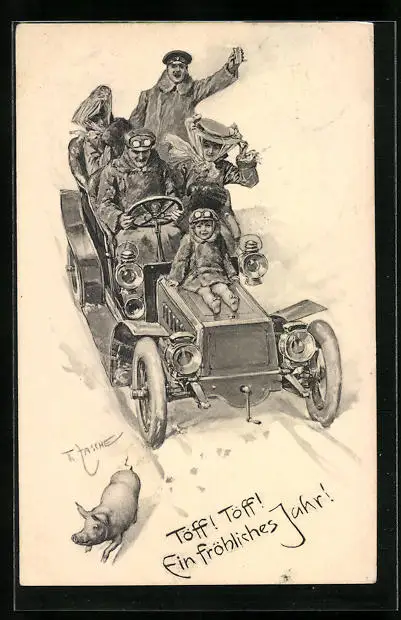 Künstler-AK Theo Zasche: Feiernde Menschen in einem Automobil