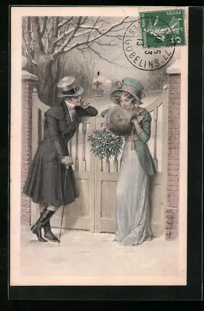 Künstler-AK Theo Zasche: Junger Herr mit Spazierstock und junge Dame mit Muff an einem Tor