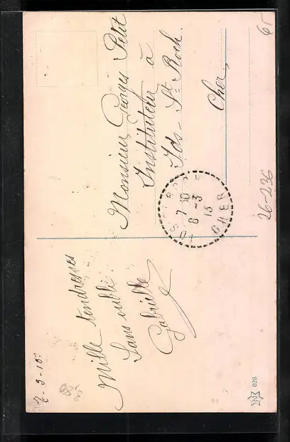 Personenbezogene Daten auf der Rückseite der Karte wurden durch blauen Textmarker unkenntlich gemacht. Die blauen Stellen sind auf die Vorderseite durchgeweicht und wirken sich negativ auf das Postkartenfoto aus