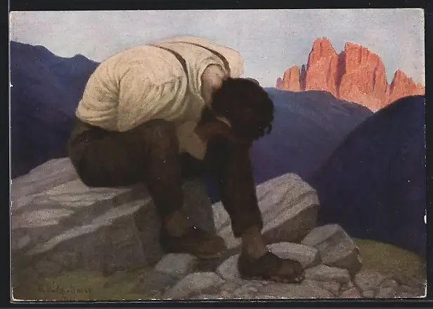Künstler-AK Thomas Walch: Älterer Herr sitzt gekrümmt auf einem Stein in Berglandschaft