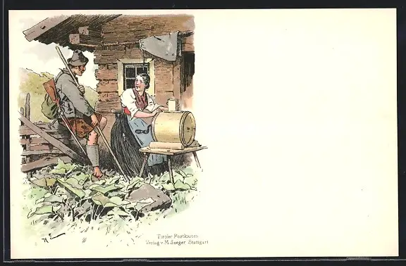 Künstler-AK Tiroler Jäger unterhält sich mit seiner Frau
