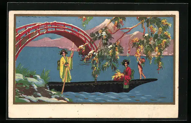Künstler-AK Tito Corbella: Geishas auf einem Boot unter blühenden Bäumen