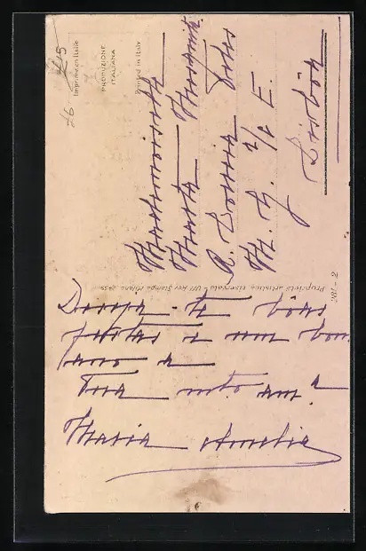 Personenbezogene Daten auf der Rückseite der Karte wurden durch blauen Textmarker unkenntlich gemacht. Die blauen Stellen sind auf die Vorderseite durchgeweicht und wirken sich negativ auf das Postkartenfoto aus