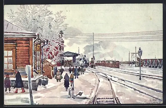 Künstler-AK Tjumen, Winterpartie am Bahnhof