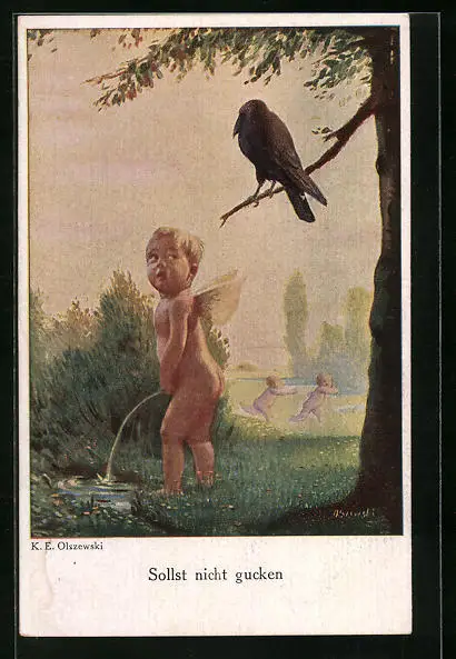 Künstler-AK Toilettenhumor, Amor uriniert ins Gras, Rabe schaut zu