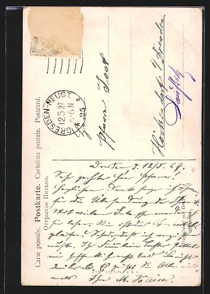 alte Ansichtskarte, gelaufen 1927, Briefmarke entfernt, rückseitig Oberflächenschaden, guter Zustand