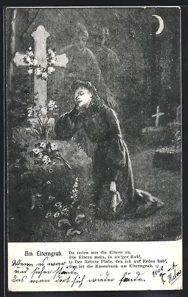 Künstler-AK Trauernde Frau am Elterngrab
