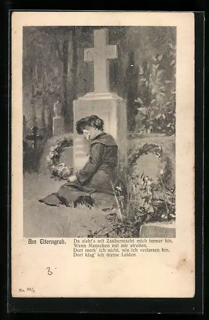 Künstler-AK Trauernde junge Frau am Elterngrab