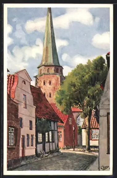 Künstler-AK Travemünde, Markstrasse mit Kirche