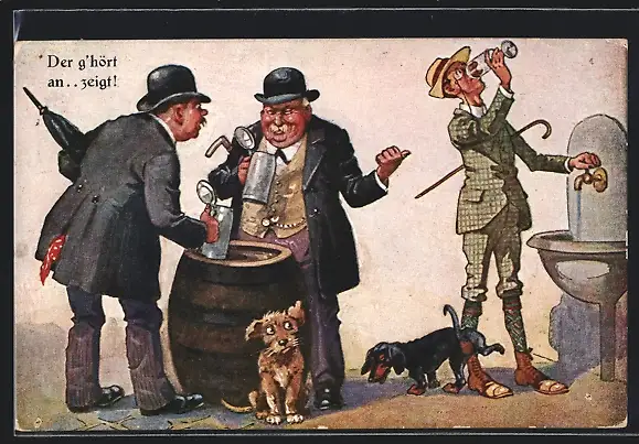 Künstler-AK Trinker lästern über einen Wassertrinker, Dackel