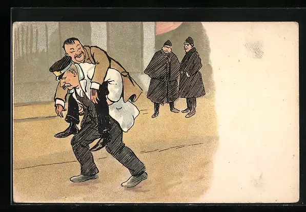 Künstler-AK Trinkerhumor, Betrunkener Mann trägt einen anderen Mann heimwärts