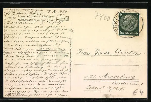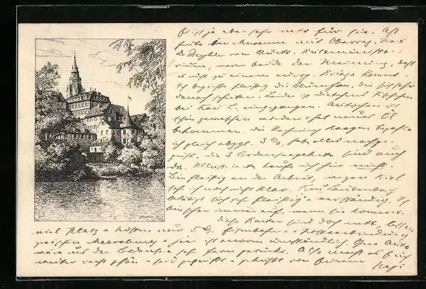 Künstler-AK Tübingen, Hölderlinturm und alte Aula