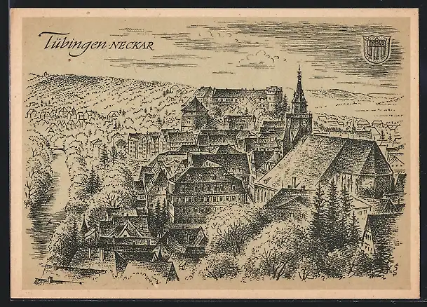 Künstler-AK Tübingen /Neckar, Ortsansicht mit Kirche