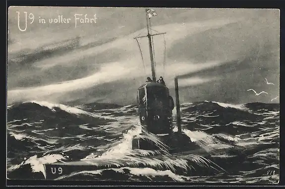 Künstler-AK U-Boot U 9 in voller Fahrt