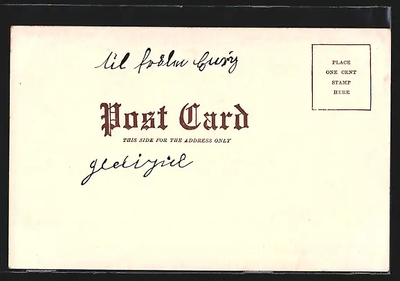 Personenbezogene Daten auf der Rückseite der Karte wurden durch blauen Textmarker unkenntlich gemacht. Die blauen Stellen sind auf die Vorderseite durchgeweicht und wirken sich negativ auf das Postkartenfoto aus