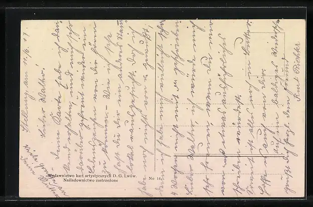 Personenbezogene Daten auf der Rückseite der Karte wurden durch blauen Textmarker unkenntlich gemacht. Die blauen Stellen sind auf die Vorderseite durchgeweicht und wirken sich negativ auf das Postkartenfoto aus