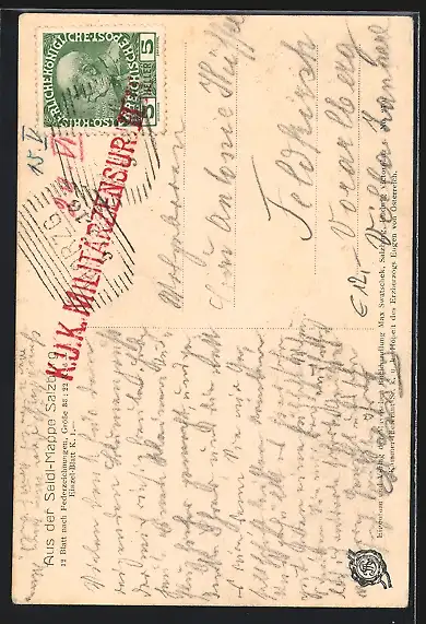Personenbezogene Daten auf der Rückseite der Karte wurden durch blauen Textmarker unkenntlich gemacht. Die blauen Stellen sind auf die Vorderseite durchgeweicht und wirken sich negativ auf das Postkartenfoto aus