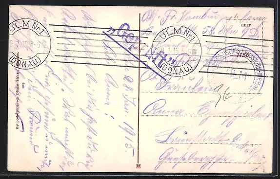 Personenbezogene Daten auf der Rückseite der Karte wurden durch blauen Textmarker unkenntlich gemacht. Die blauen Stellen sind auf die Vorderseite durchgeweicht und wirken sich negativ auf das Postkartenfoto aus