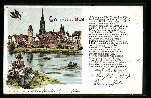 Künstler-AK Ulm, Uferpartie mit Kirche