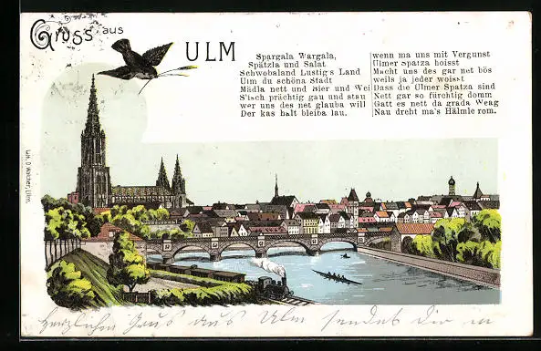 Künstler-AK Ulm, Uferpartie mit Münster und Ulmer Spatz