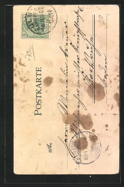 Personenbezogene Daten auf der Rückseite der Karte wurden durch blauen Textmarker unkenntlich gemacht. Die blauen Stellen sind auf die Vorderseite durchgeweicht und wirken sich negativ auf das Postkartenfoto aus
