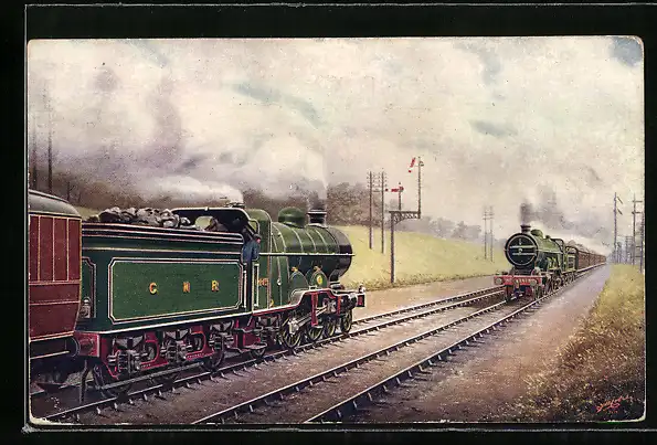 Künstler-AK Up Scotch Express passing the Down Leeds Express