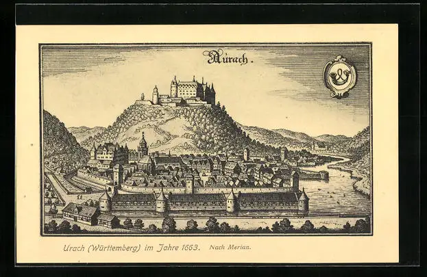 Künstler-AK Urach i. Württemberg, Ortsansicht im Jahre 1663 nach Merian