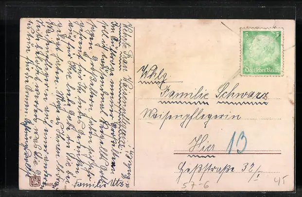 Personenbezogene Daten auf der Rückseite der Karte wurden durch blauen Textmarker unkenntlich gemacht. Die blauen Stellen sind auf die Vorderseite durchgeweicht und wirken sich negativ auf das Postkartenfoto aus