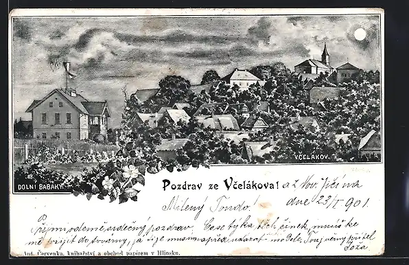Künstler-AK Vcelákov, Ortsansicht bei Vollmond