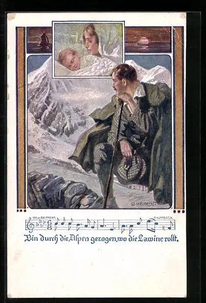 Künstler-AK W. Braun: Bergsteiger denkt an die Seinen zu Hause