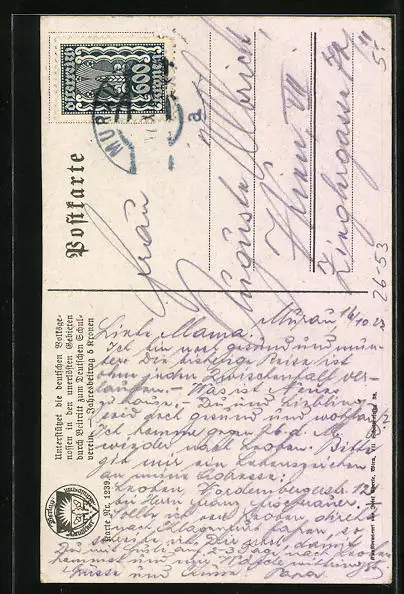 Personenbezogene Daten auf der Rückseite der Karte wurden durch blauen Textmarker unkenntlich gemacht. Die blauen Stellen sind auf die Vorderseite durchgeweicht und wirken sich negativ auf das Postkartenfoto aus