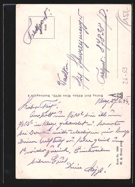 Personenbezogene Daten auf der Rückseite der Karte wurden durch blauen Textmarker unkenntlich gemacht. Die blauen Stellen sind auf die Vorderseite durchgeweicht und wirken sich negativ auf das Postkartenfoto aus