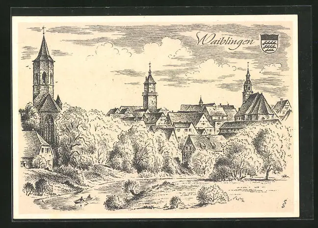 Künstler-AK Waiblingen /Baden Württemberg, Teilansicht mit Kirche